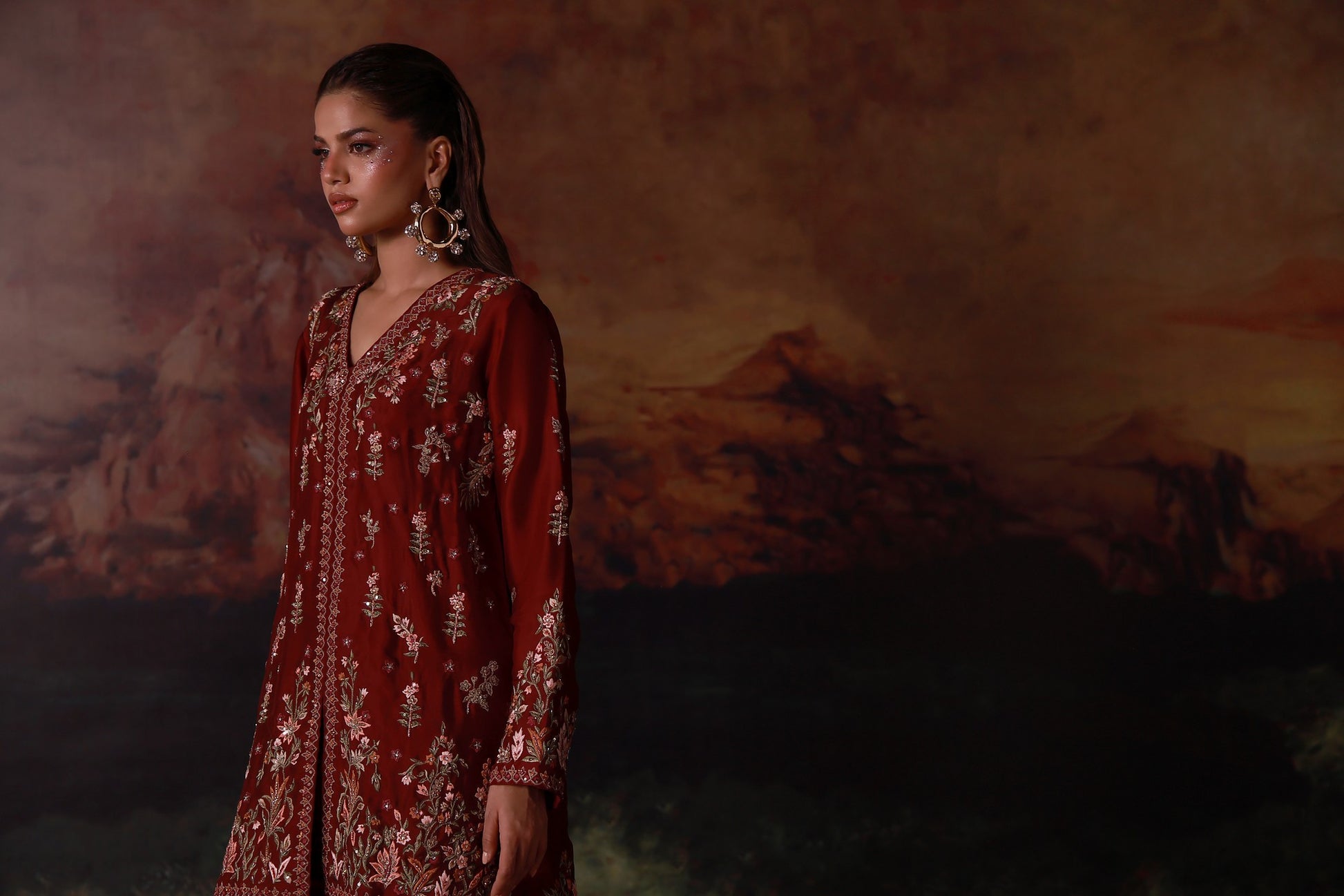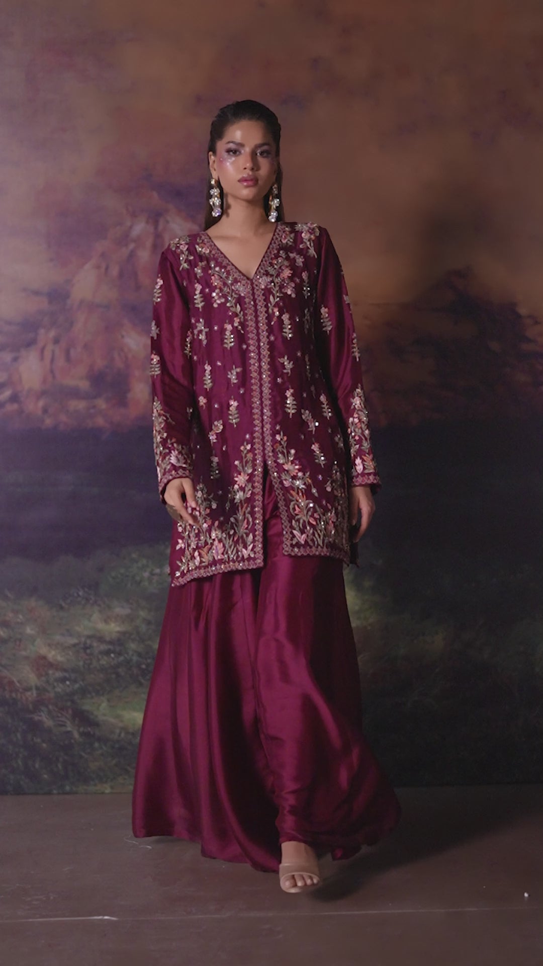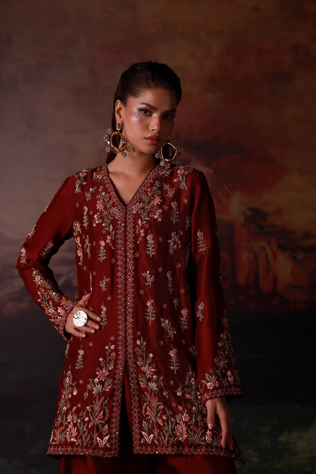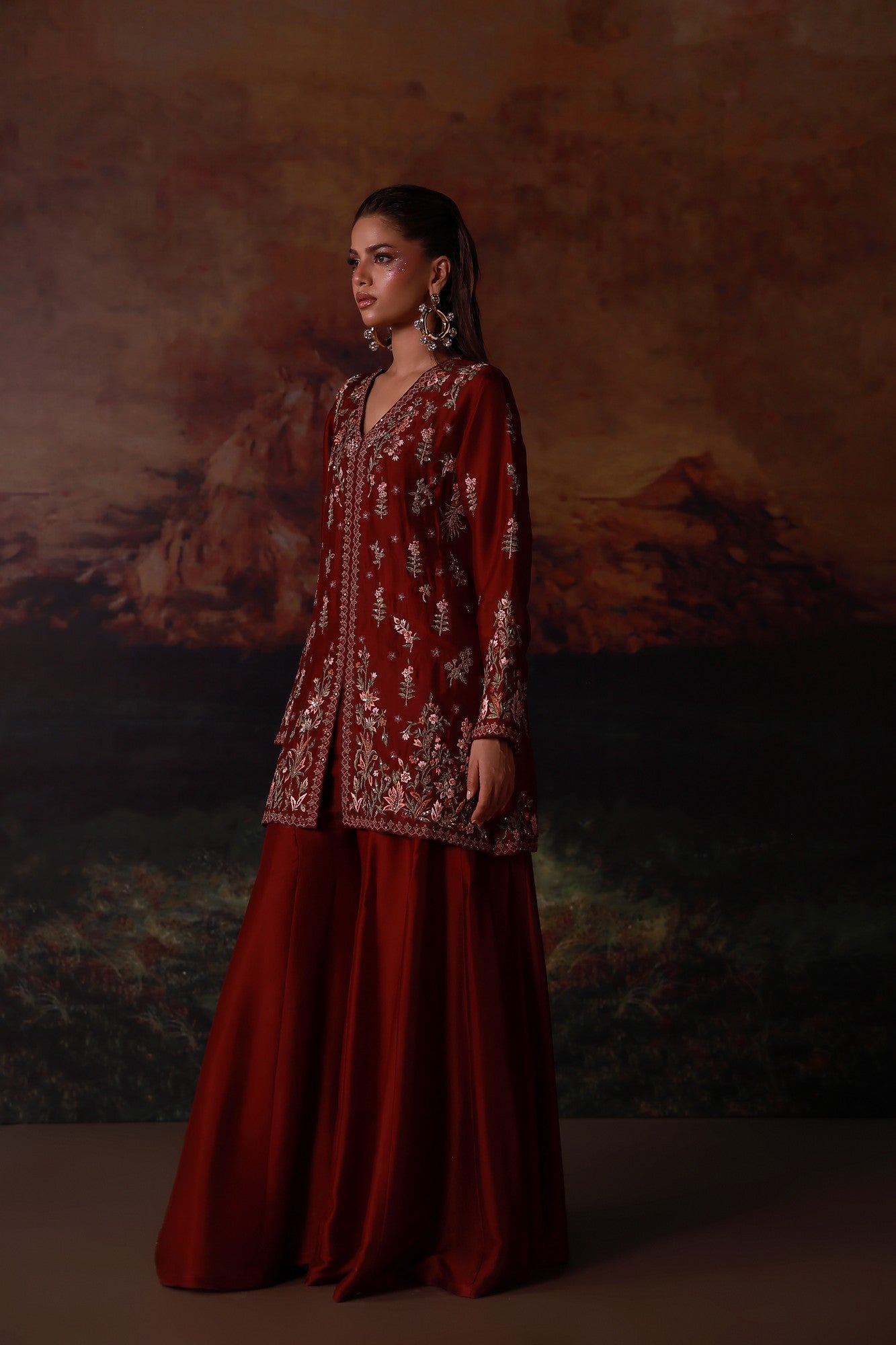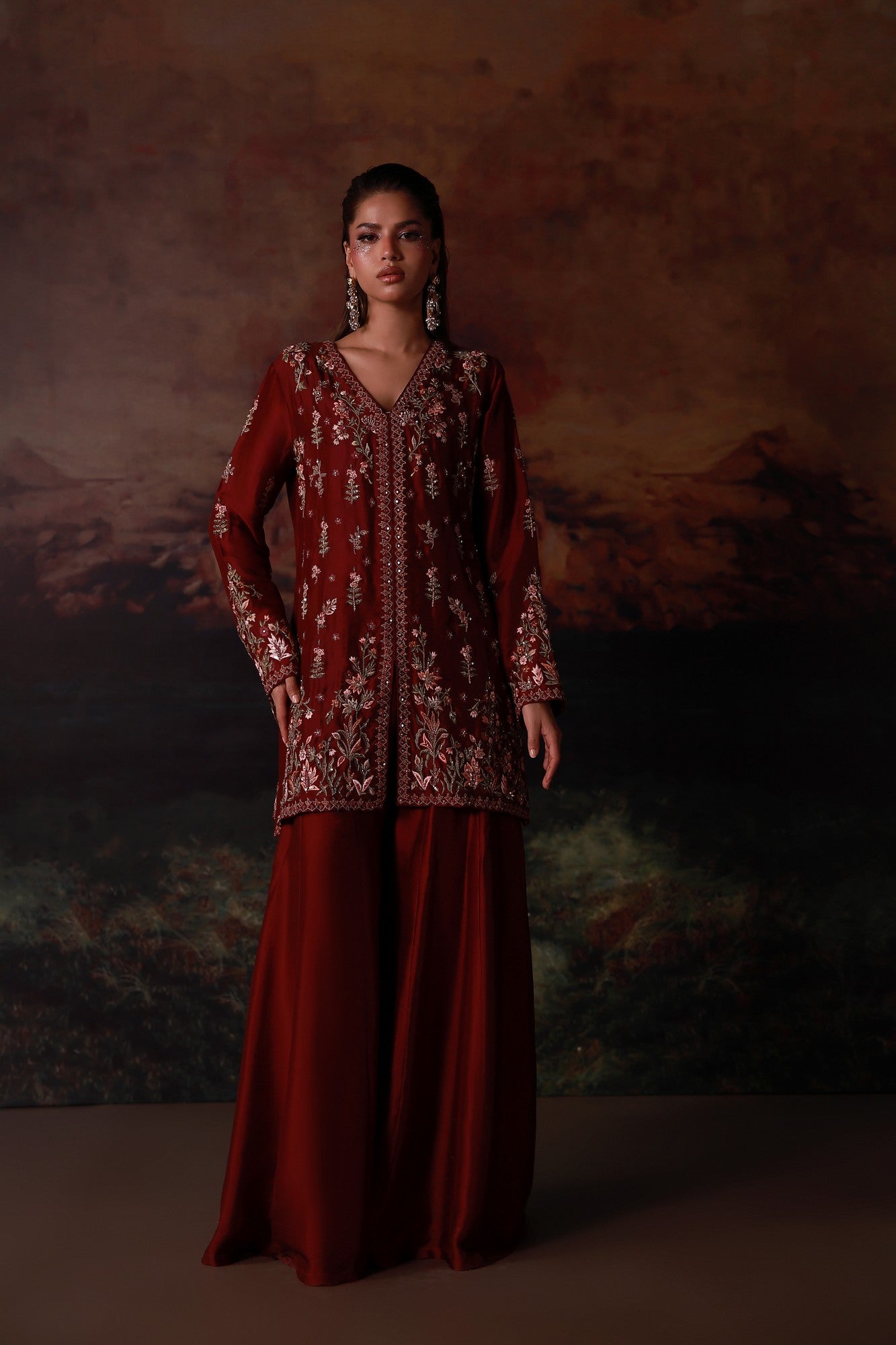This refined maroon jacket paired with flared pants is a statement of modern sophistication. The jacket is intricately detailed with rich embroidery and delicate hand embellishments, creating depth and a luxurious finish. Balanced by flared pants, the ensemble offers a graceful silhouette that blends contemporary tailoring with classic craftsmanship.