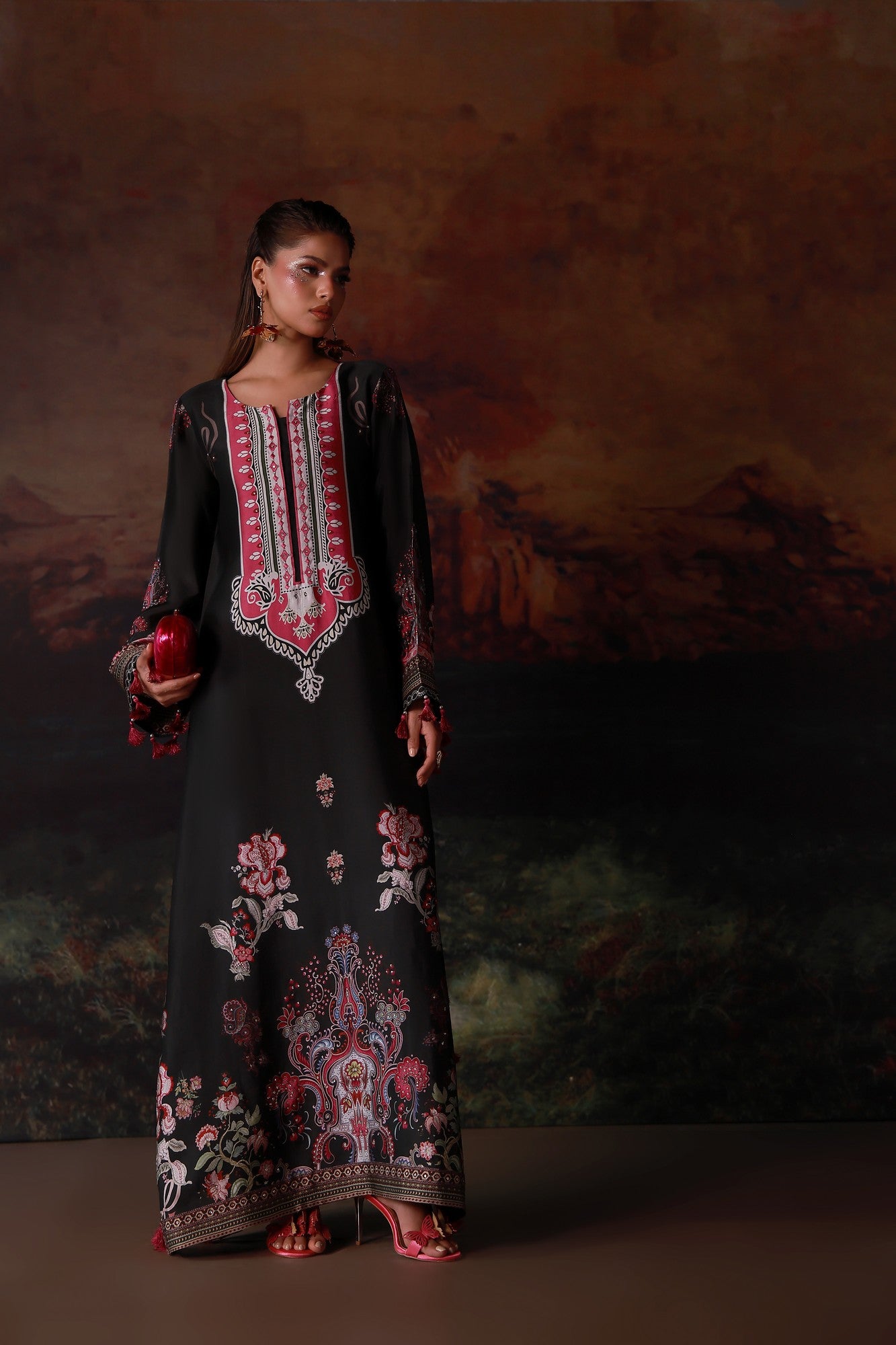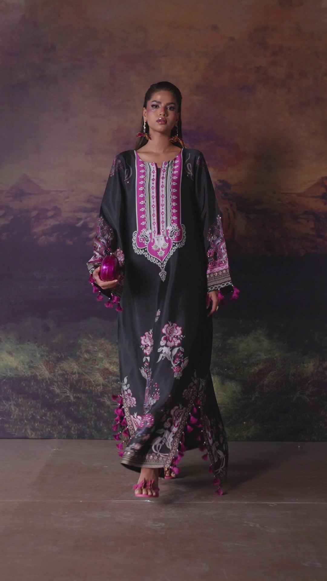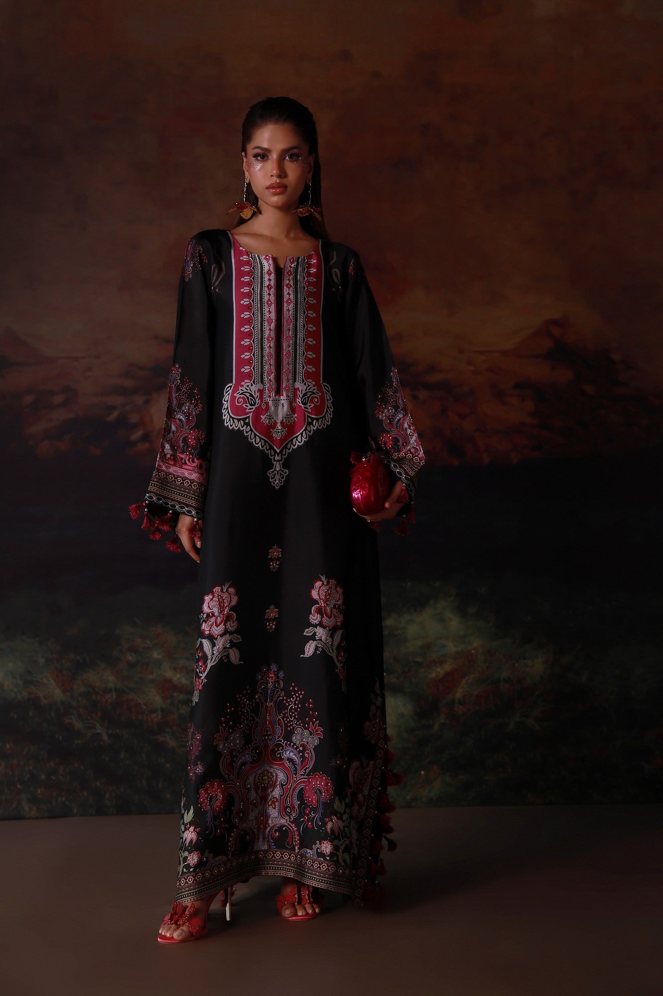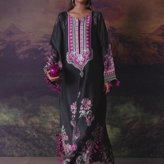 A statement pure buttersilk kaftan featuring a rich, flowing silhouette. The intricately printed design is enhanced with delicate Swarovski embellishments, adding subtle brilliance and depth. Effortlessly elegant, it is perfect for festive evenings and elevated occasions where modern glamour meets comfort.
