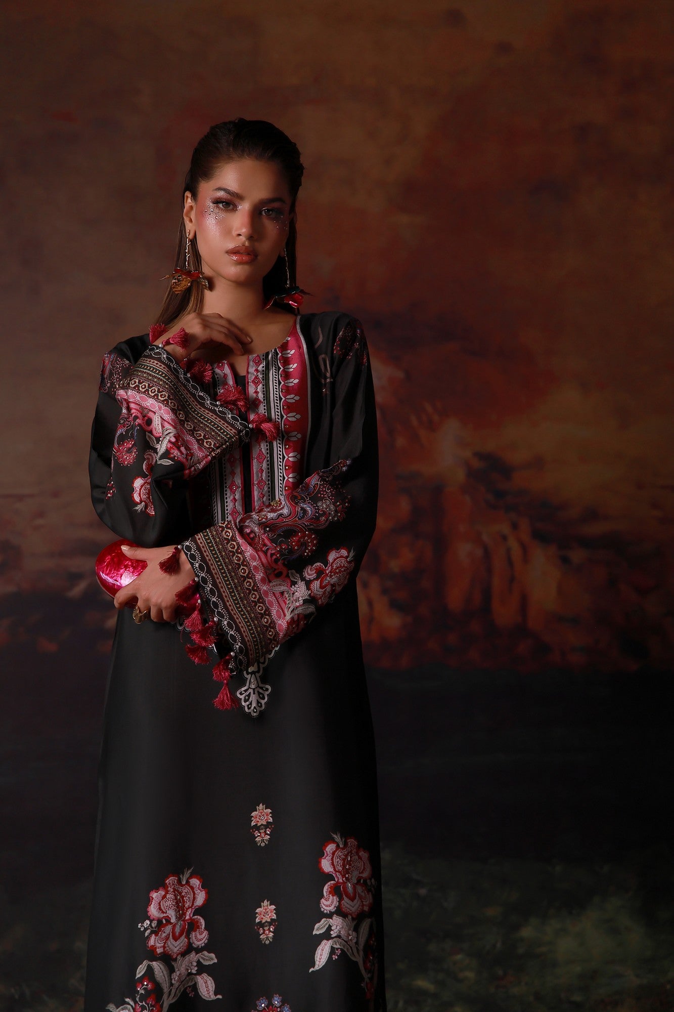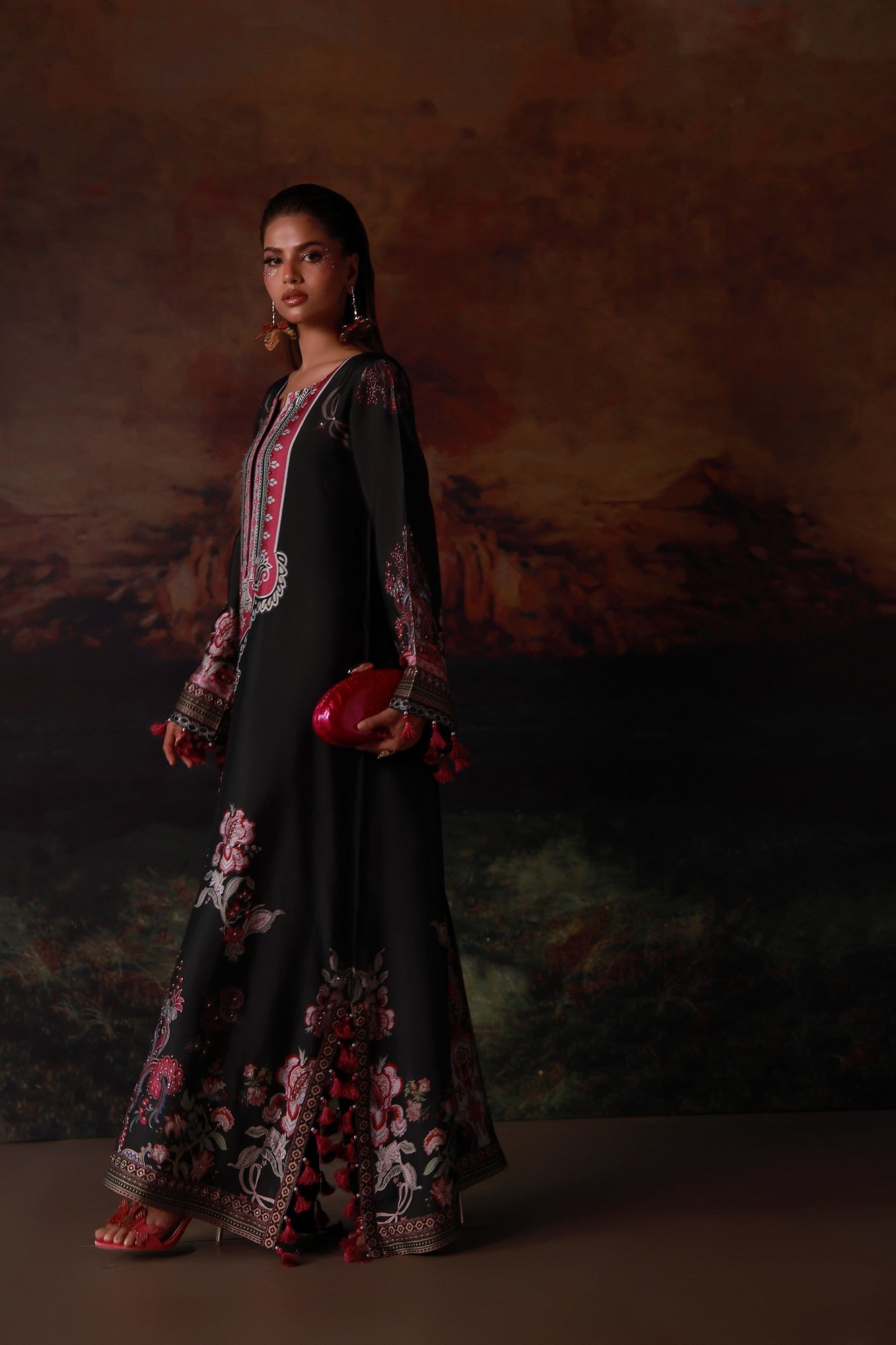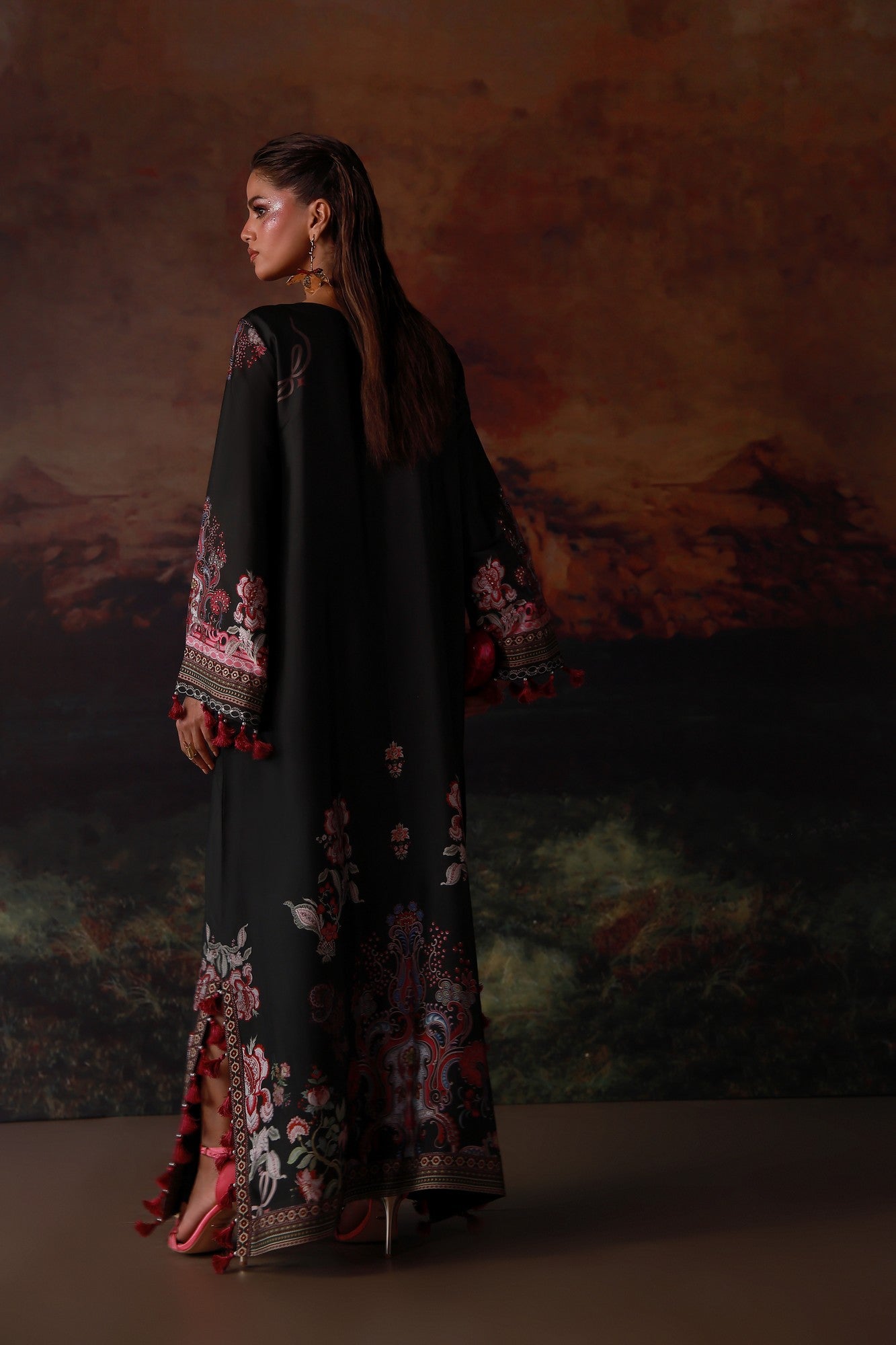 A statement pure buttersilk kaftan featuring a rich, flowing silhouette. The intricately printed design is enhanced with delicate Swarovski embellishments, adding subtle brilliance and depth. Effortlessly elegant, it is perfect for festive evenings and elevated occasions where modern glamour meets comfort.